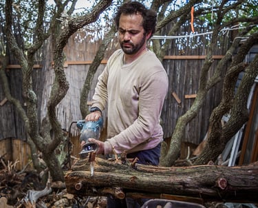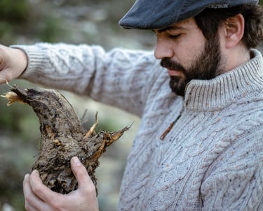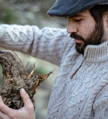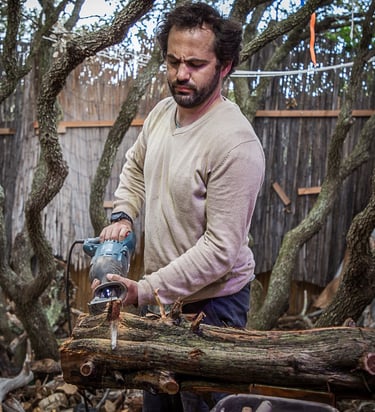 « Une poutre en Chêne d’un vieux moulin abandonné, une souche de Cade dénichée dans une forêt brûlée, une racine d’Olivier échouée après une tempête sur la plage ... Ce sont mes trésors. »